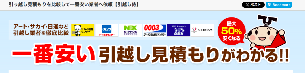 公式サイトはこちら 引越し侍 290社以上の中から最大10社まで無料一括見積もり! 引越し料金を最大50%安くすることができます! ご利用者様限定のお得な特典もございます。 利用者の95.2%がまた利用したいと回答されています。 学生の引っ越しや単身パック、レディースやシニア向けプラン、 家具だけの引っ越し見積もりなど、ライフスタイルに 合わせた引越し見積もりが可能です!! 商品名 引越し侍 カテゴリ 引っ越し掃除